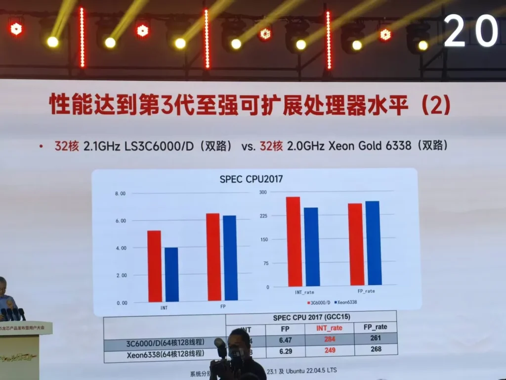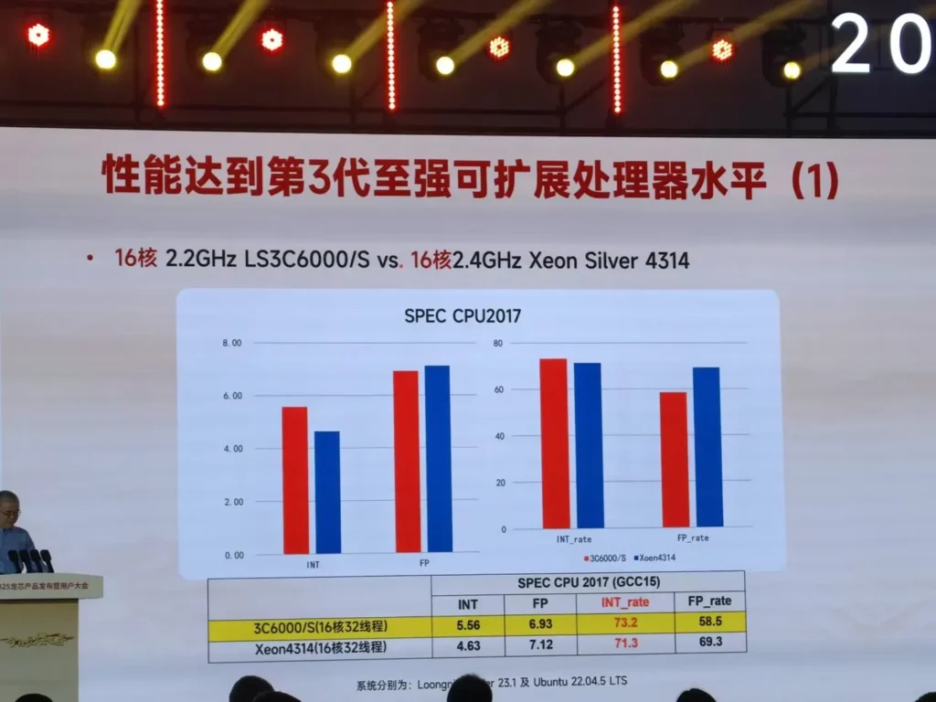 Loongson также раскрыла некоторые данные о производительности представленных процессоров. Модель LS3C6000/S с 16 ядрами и частотой 2,2 ГГц была сопоставлена с процессором Intel Xeon третьего поколения (Ice Lake-SP) — 16-ядерным Xeon Silver 4314 с частотой 2,4 ГГц. По утверждению компании, её чип демонстрирует более высокую целочисленную производительность в тесте SPEC CPU 2017 (GCC15), но немного уступает в задачах с плавающей запятой. В свою очередь 32-ядерный китайский процессор оказывается впереди в трёх из четырёх тестов. 64-ядерный вариант на частоте 2,1 ГГц показывает превосходство в целочисленных вычислениях над 40-ядерным Xeon Platinum 8380 (2,3 ГГц).