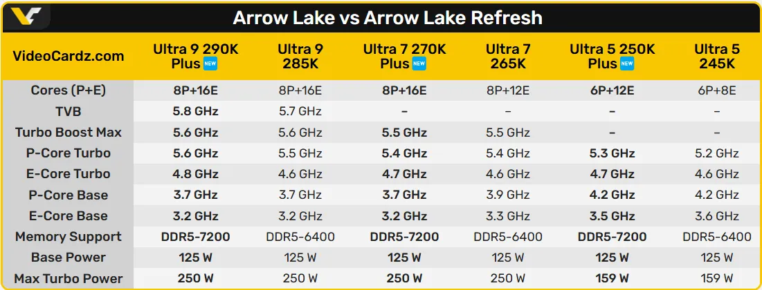 В обновлённой версии Arrow Lake Refresh эти улучшения интегрированы непосредственно в спецификации процессоров. Флагманский Core Ultra 9 290K Plus сохранит конфигурацию 8 производительных (P-core) и 16 эффективных ядер (E-core), как у модели 285K, но увеличит максимальную частоту Thermal Velocity Boost до 5,8 ГГц (было 5,7 ГГц). Частота E-core Turbo также вырастет — до 4,8 ГГц. При этом базовое энергопотребление останется на уровне 125 Вт, а максимальное — на уровне 250 Вт.